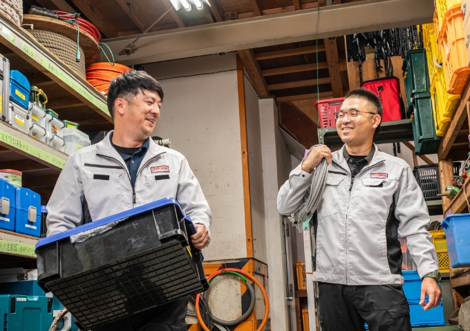 その理由は、社内に専門性の異なる4つの部署が連携して業務にあたっているからです。現地の状況を的確に把握する「調査・設計」、確実な据付を担う「工事・施工」、安定運用を支える「保守・サービス」、そしてお客様との窓口となり全体をサポートする「総務・営業」。各部署が常に情報を共有しながら動くことで、スムーズで無駄のない対応を実現しています。