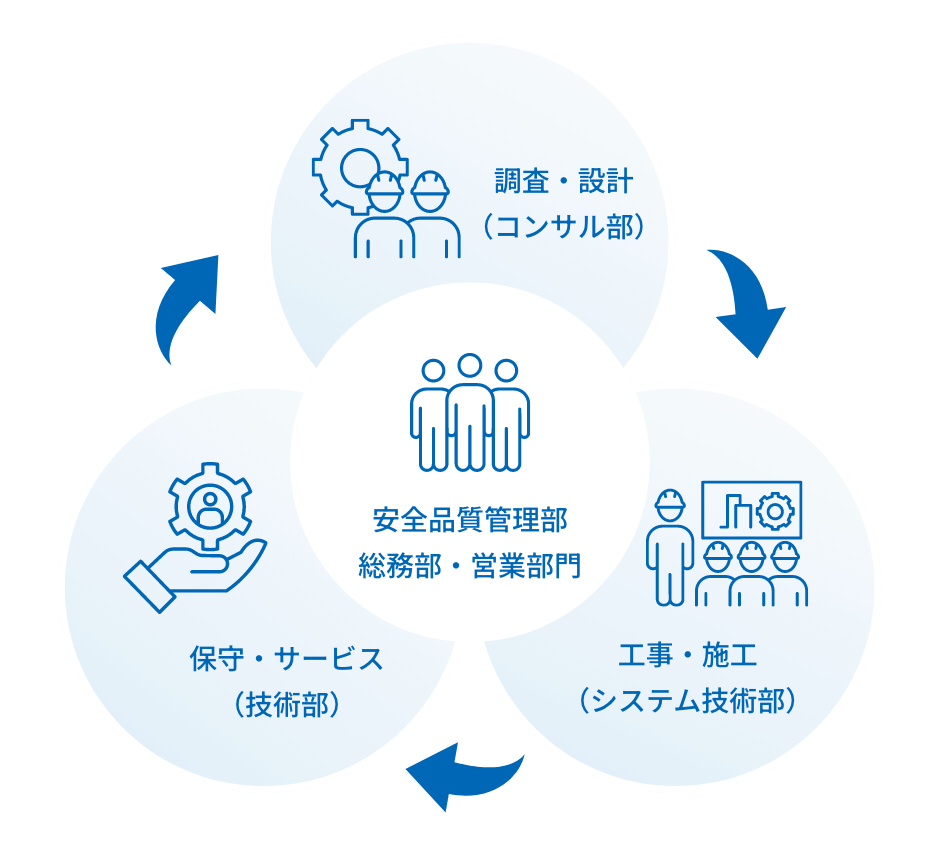私たちは、調査・設計から施工、保守、そして営業・サポートまで、防災インフラに関わるすべての業務を自社内で一貫して対応できる体制を整えています。