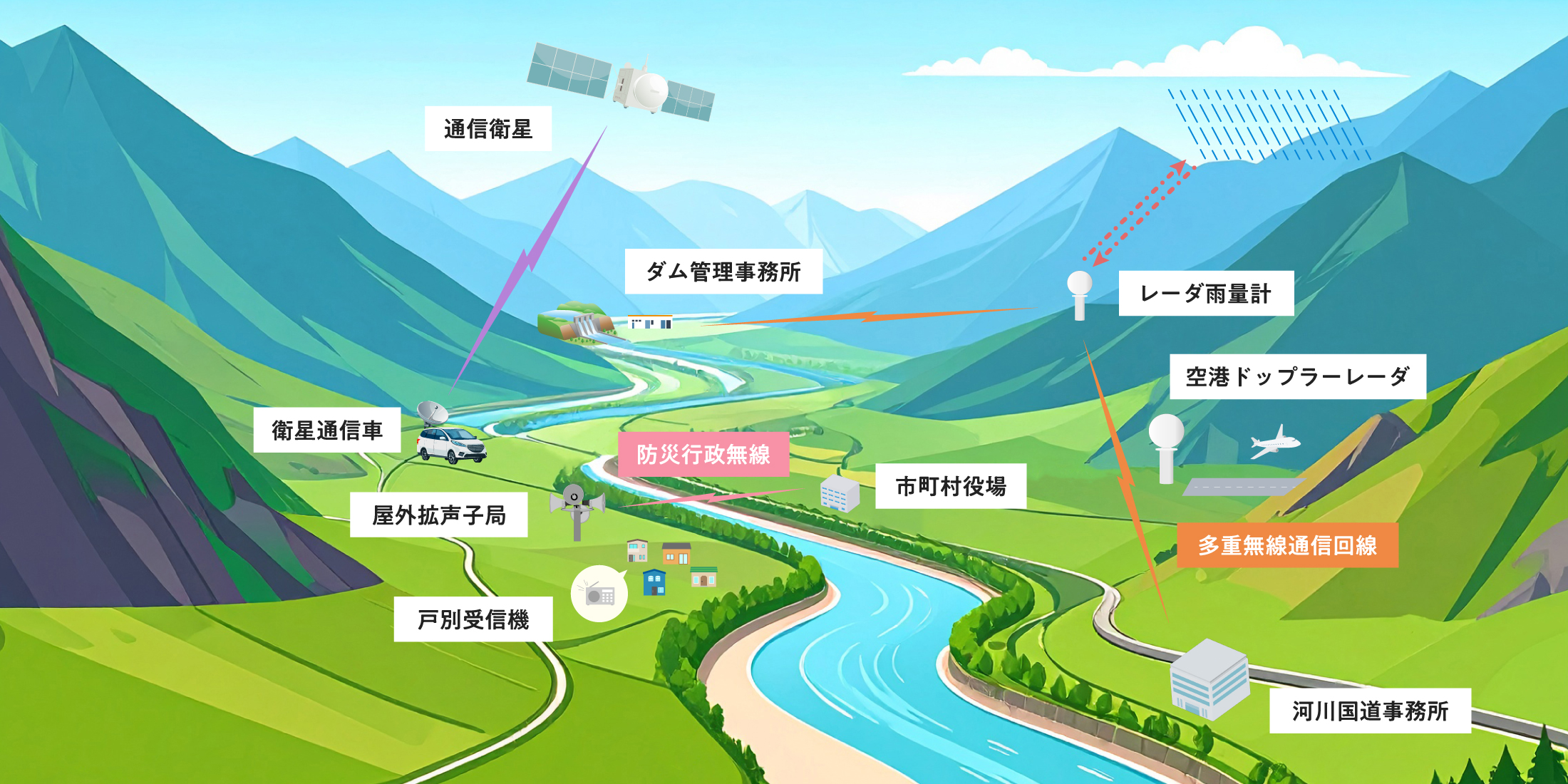 レーダ雨量計で降雨を正確に捉え、衛星通信システムで現場と災害対策本部等をつなぐ